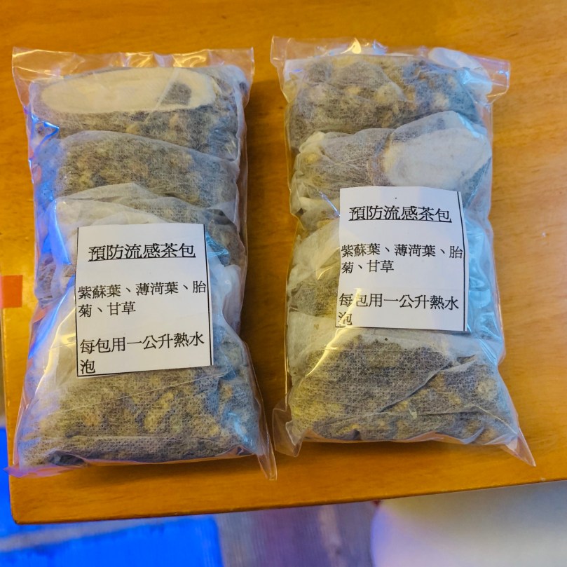 我們本地的有機農夫們,做了些流感茶包,寒底和熱底都可以飲用,放了幾片甘草做藥引,一起泡茶,其他的材料易溶解於甘草溶液中,藥效更能發放。
