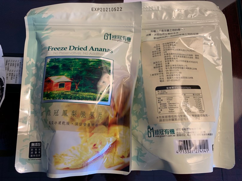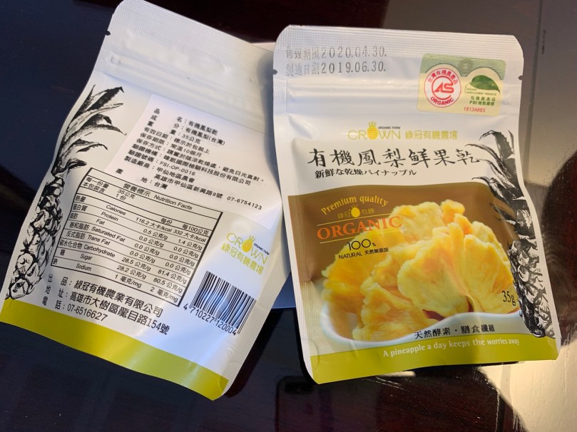 我在高雄順道去了我認識的綠冠鳳梨種植場(在高雄有很大的種植場),訂購了一批鳳梨脆片(約$40)及鳳梨果乾(細包裝約$25),還有500克的經濟裝(約$250),及一片獨立包裝的(約$8)。冇任何添加及糖,有機認證產品。稍後如果有興趣,可給大家清單訂購。
